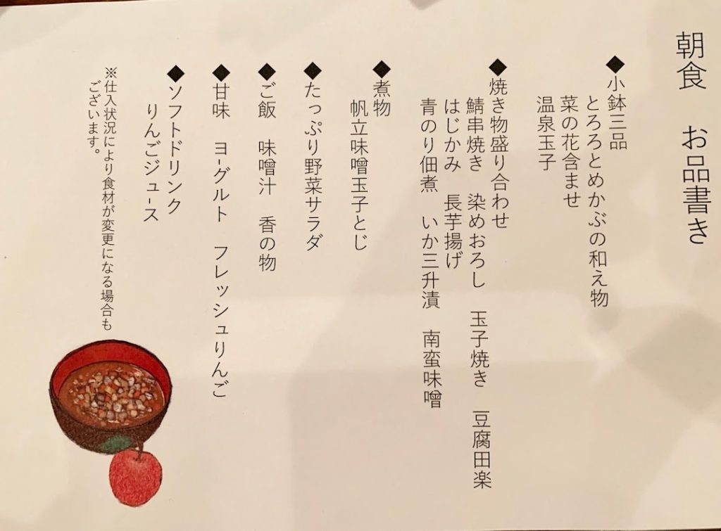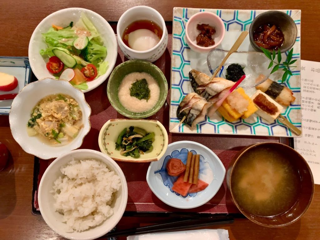 散策の後は朝餉。昨日と同じ場所、同じ席でセットメニューの朝食膳。朝食ビュッフェを取り分けてこの膳にしてくれている。昨日の夕食膳と同様、これもまた美味しだった。