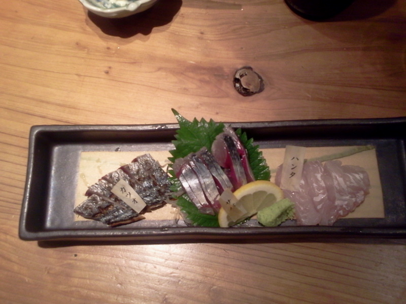 まずは刺身の三点盛りを。天草、地のもの。かつお・さば・はんた。はんたとは、ブダイのことらしい。旨かった!ビールと、よく合う。