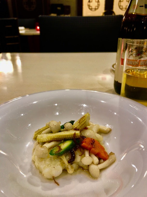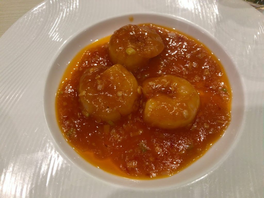 コース料理。まず前菜、ふかひれスープと続き、写真のこれは、イカと野菜のXO醤炒め。なんとも…旨し。XO醤の味わいは実にほのかだが、醤の存在感は確かに感じられ、薄味ながら繊細な味わい。化学調味料は使ってないんだろな。期待を上回る。ここまでは穏やかな料理。四川というよりは広東なんだろな。