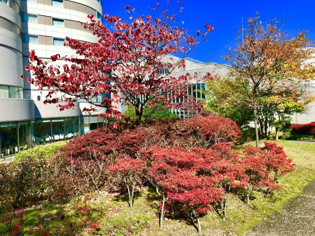 あらためて、ホテルと周りの紅葉を。紅の紅葉が青空に映えて、きれいだったな。