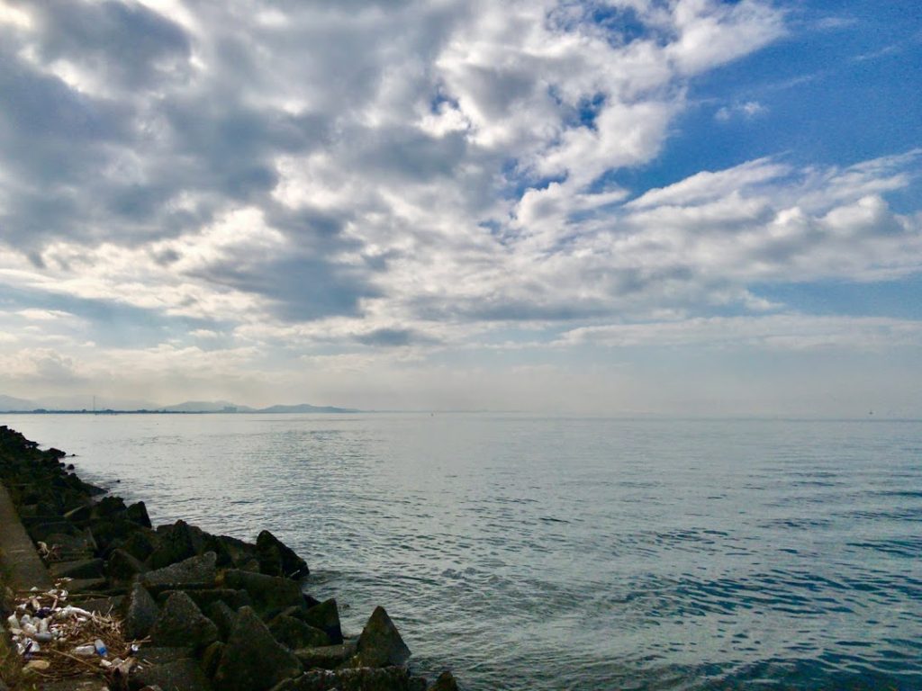しばらくして、早朝の腹ごなしに琵琶湖を散策。雲が切れ、晴れ間が出てきた。暗いムードが一変、明るい凪の琵琶湖が。この変わりようと言ったら・・凄いな。変化率が。従い、当方の気持ちも晴れやかに。気分なんて、ちょっとしたことで変わるな。。