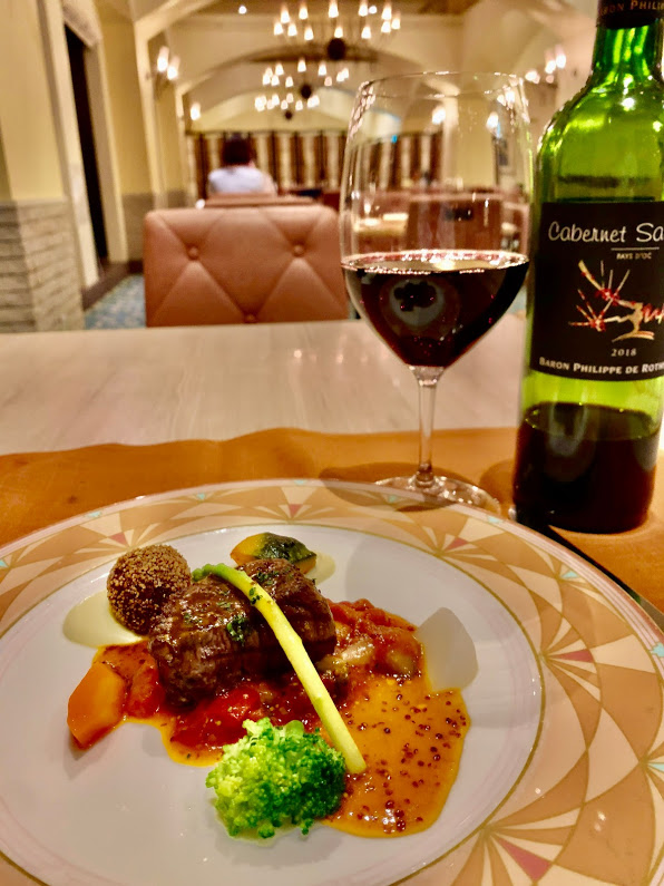 さてさて、これから夕食を。三択出来るようになっていて、他には和食やビュッフェもあったけれども。ここはフレンチを選ぶところだよな。ホテルのロビー階から、やはりインスタ映えしそうな階段を上っていくと・・・