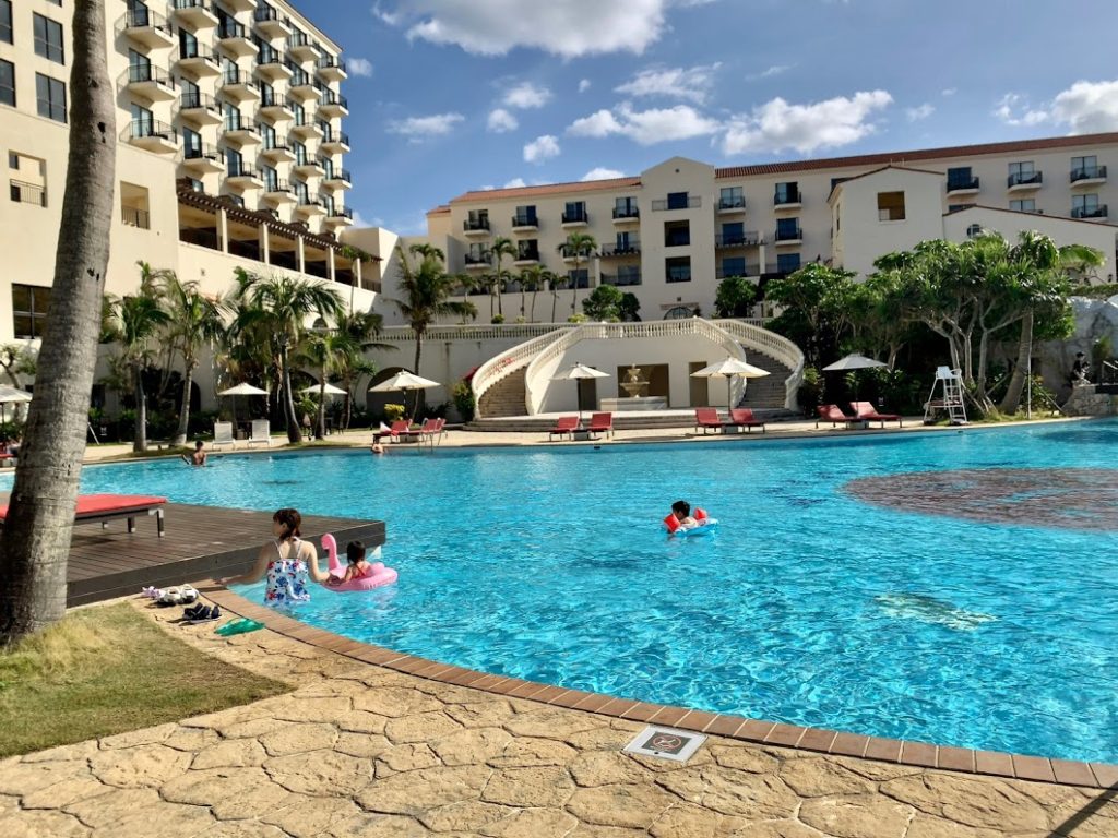 昼が近づき、お日様が出てきた!プールに来てみる。That's リゾート!いいな!みんな嬉しそう。華やぐな。今日は10月24日なのに。沖縄はまだまだ泳げるんだな。