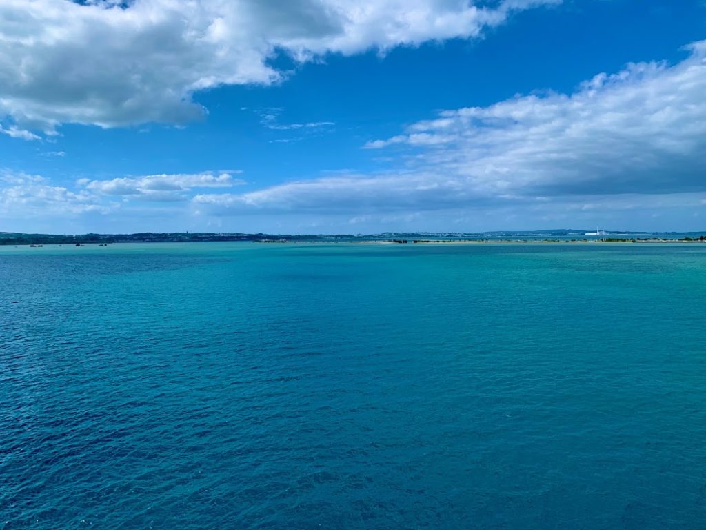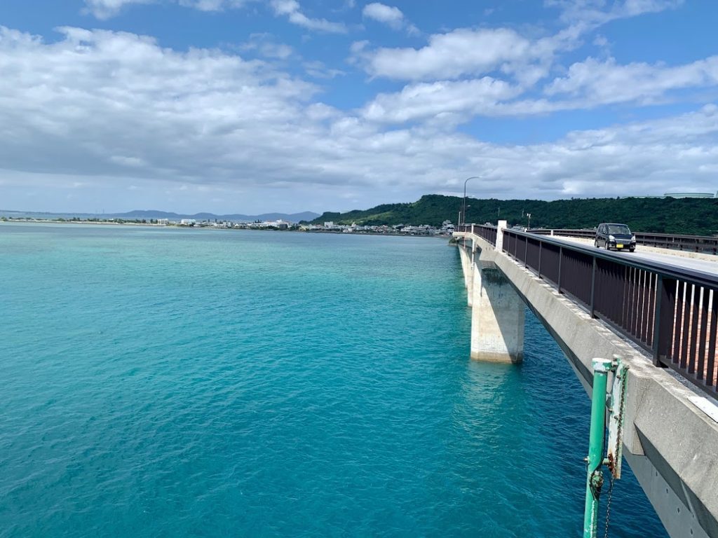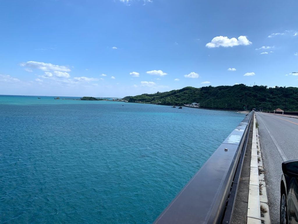 これが大正解!浜比嘉(はまひが)大橋からの海がきれい。見ての通りの空の碧、コバルトブルーの海、木々の緑。そして橋。最高だって。くどいが、橋を渡ってこの島に来て大正解。それしか言えない。