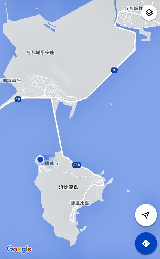 伊計(いけい)島を後に。この写真でいうとローソン与那城海中道路店のところに、浜比嘉(はまひが)島に向かう道が枝分かれしている。海がきれいに見えそうな橋があるんだな。飛行機にはまだ時間がある。予定はしていなかったが、えいや!と思い付きで、ハンドルを左に切る。どうか。