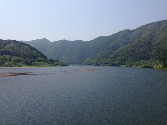 佐田沈下橋を渡る途中から望む、四万十川の川下・川上。沈下橋の上は、結構風が強く吹いているもんなんだな。この写真を撮った、手