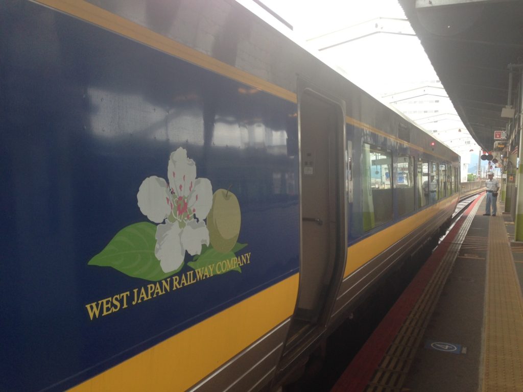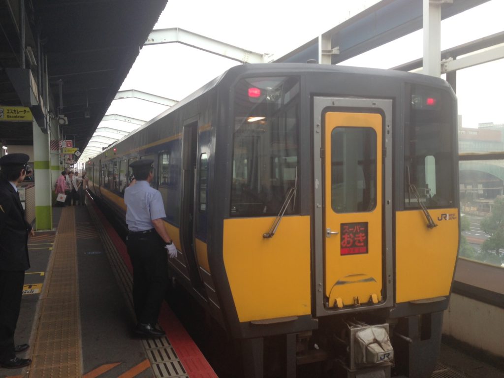 2両編成の特急おき。指定席と自由席の二両。でも車両横から見たデザイン、なかなか難しいんですよね。正面から見ると黒と黄色のデザイン、横の見た目は青と黄色。そしてこんな花の絵が。
