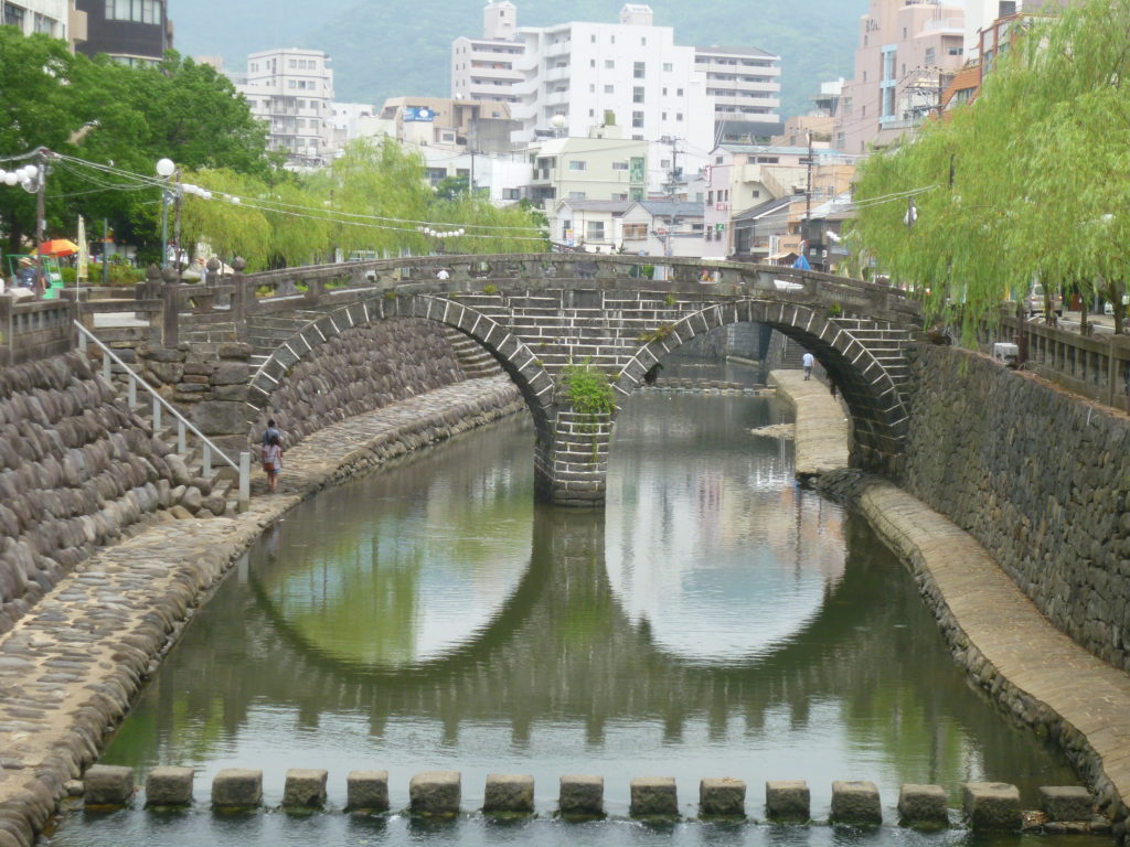 長崎名物、眼鏡橋。この日は川の水がおだやか、濁ってないせいか、眼鏡のかたちがきれいに出てるな。