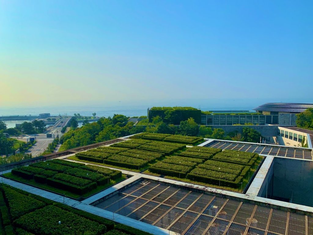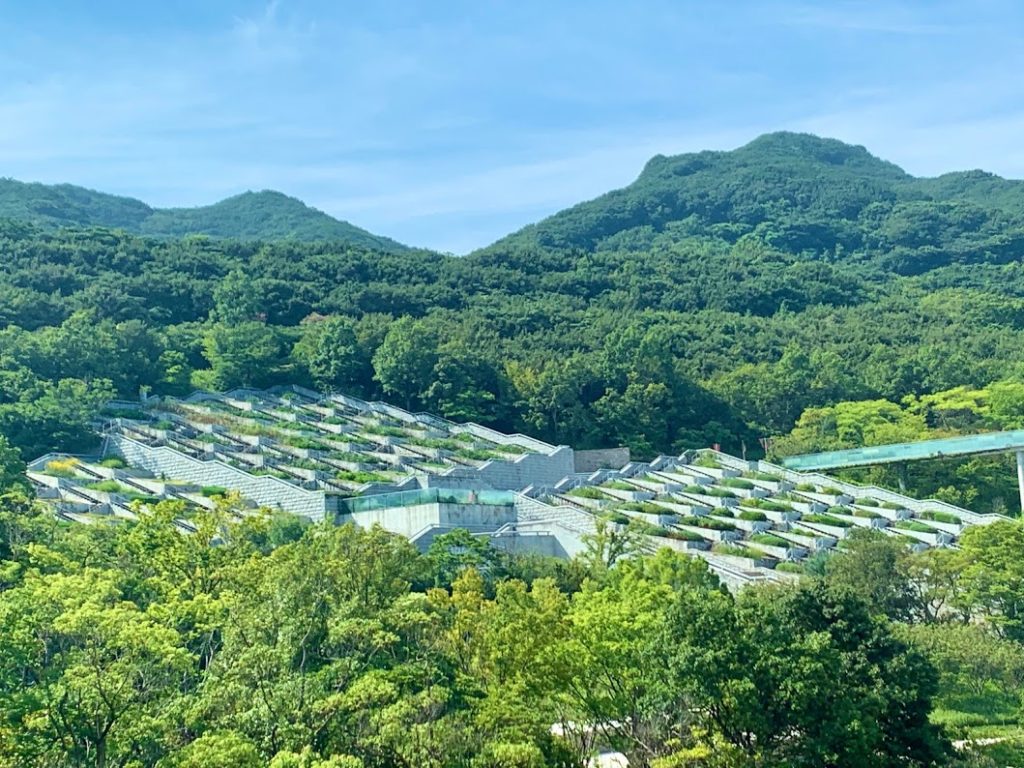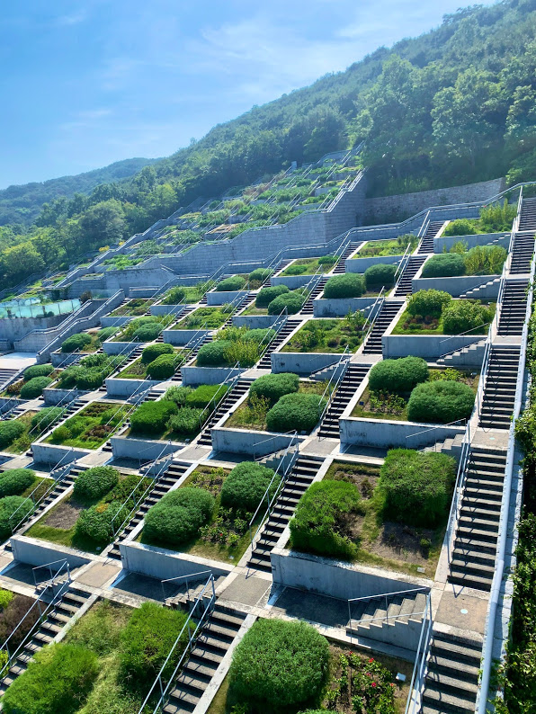 夕食までまだ時間がある。これからホテルの周りを散策に出かけよう。下りのエレベーターを待っていたら、窓からこんな景色が。建築家の安藤忠雄氏による淡路夢舞台の一つ、百段苑(ひゃくだんえん)だな。遠くにあるのでリアルにはわからないが、ここの存在感は感じた。これから行ってみようかな。