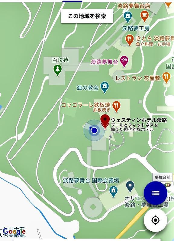 このホテルと淡路夢舞台、そして百段苑(ひゃくだんえん)の位置確認を。