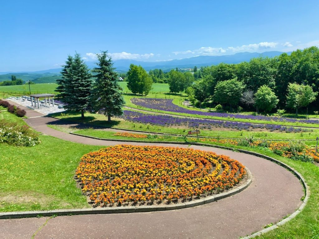 美瑛の富良野寄りに、こんなきれいなお花畑があった。とてもきれい。ここもファーム富田と同様、蝶とハチとがゆるゆると飛び交い、いいムードだったな。