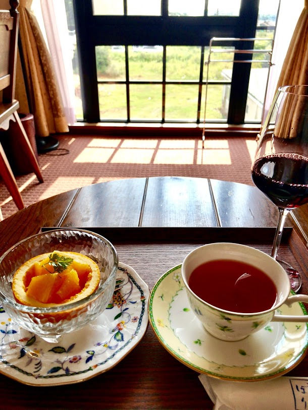 宿の女性スタッフが、ウェルカムドリンクとフルーツを持ってきてくれた。これは嬉しいな。ハーブティーの香りはローズヒップ?なんともいい感じな。