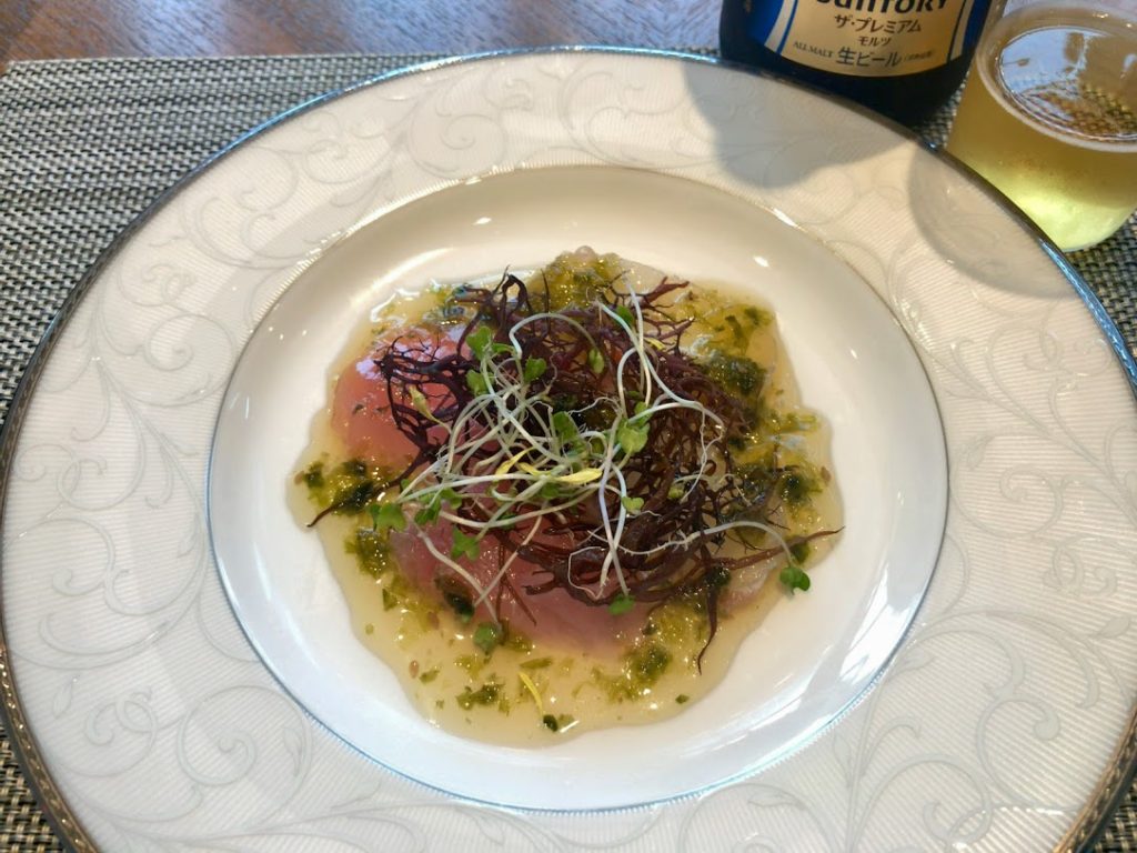 前菜の後に、びんちょうまぐろとスズキのカルパッチョ。鮮烈なフレッシュなゆず風味だった。旨しな。