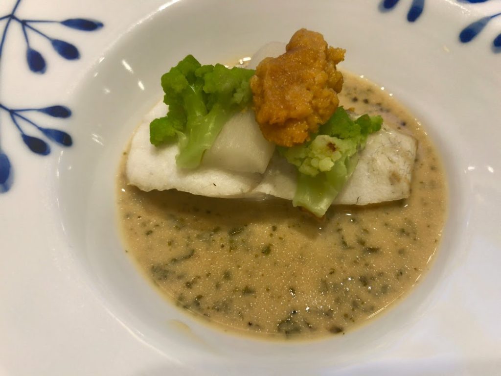 スズキのグリル、ウニ乗せ。伊勢エビのグリルとはまた違った味わいに仕上げたアメリケーヌソースでと。う〜む。確かに異なるが、こちらも実に、旨しな。