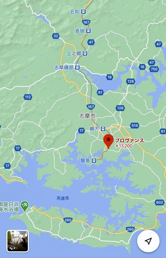 位置関係を。近鉄志摩線の終点、賢島(かしこじま)から、そして英虞湾(あごわん)から近いんだな。