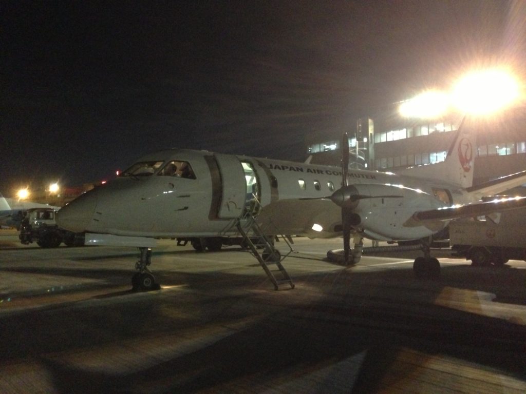 ちっこいプロペラ機、JALのCAさん。情緒ある方だった。よかよか。ただし夜間移動なので、景色は全然見えず。