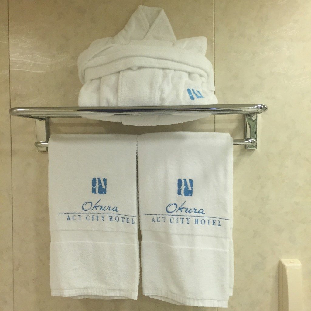 部屋に戻る。バスルームにバスロープとタオルが置いてあった。さすがにホテルオークラ仕様、バスロープの生地が厚いな。