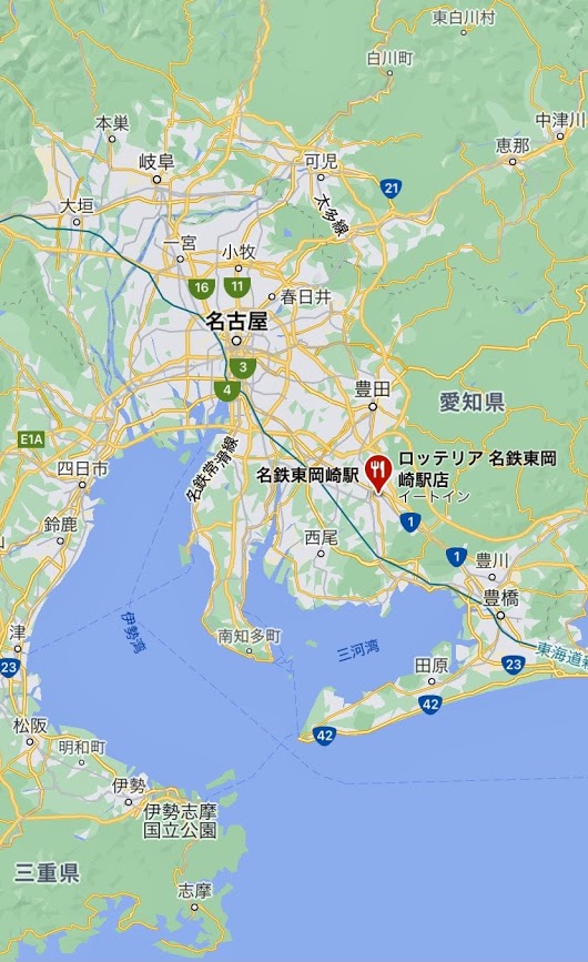 最後に位置関係を。東岡崎は名鉄名古屋本線、名古屋と豊橋の間に位置しているな。なぜか地図上にロッテリア・・・とあるが。Google マップを検索したら何故か出てきた。これに深い意味はない。東岡崎駅だけにご注目ください。