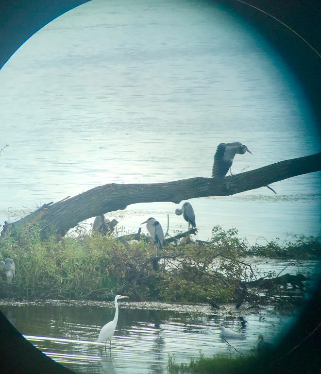 野鳥センターの望遠鏡の中を撮ったもの。大きな鳥がたくさんいる。アオサギと、後はおそらく、手前がダイサギかなと、友人である「日本野鳥の会会員」がfacebookで曰く。まあ、綺麗だよな。