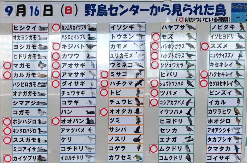 この日、野鳥センターで見られた鳥に〇が付けられてる。種類がとても多い。琵琶湖はバードウオッチングの聖地みたいだな。