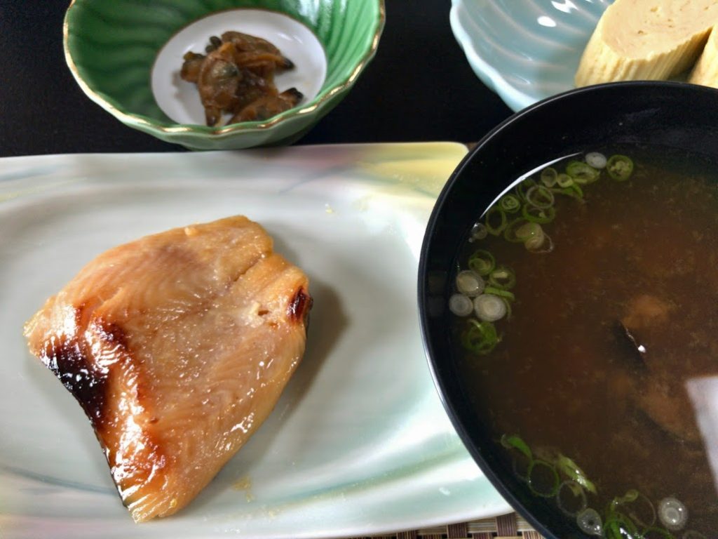 朝餉。ビワマスの味噌漬け焼きがたまらない。脂が乗ってるな。お味噌汁の味噌は手前味噌、四年物と。琵琶湖のシジミが入っている。これは深みのある汁。ほっこりとな。