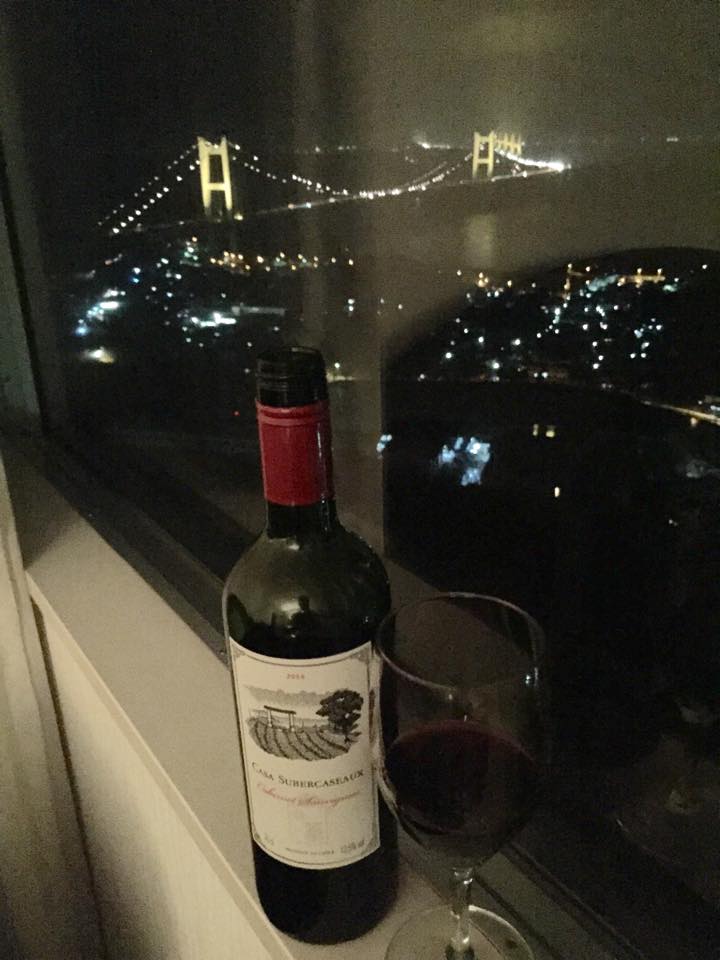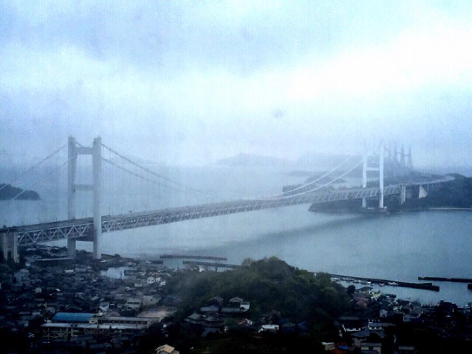 この日の部屋からの眺望。瀬戸大橋が見えるが・・あいにくの雨で、こんな感じ。まあ景観は、明日の朝に期待だな。それにしてもこの角度からの瀬戸大橋、見下ろす感じの眺め、なかなか、できないよなぁ。