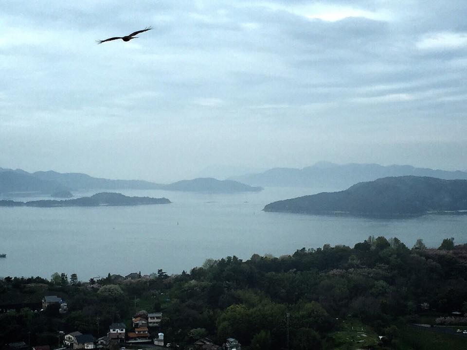 夕食の後はもう一度露天風呂に入り、部屋でワインを一人飲み。この日は瀬戸大橋の開通記念日らしく、瀬戸大橋のきれいなライトアップ、ホテルの部屋から見ることが出来た。偶然とは言え、すごい日に宿に泊まったもんだな。色々と考え事をしながら、気が付いたら眠りに落ちていた。 翌朝。雨ではないが、曇り。だんだんと薄日が差してきたが・・・下の写真は、瀬戸大橋のもう少し西側。トンビが飛んでいるな。