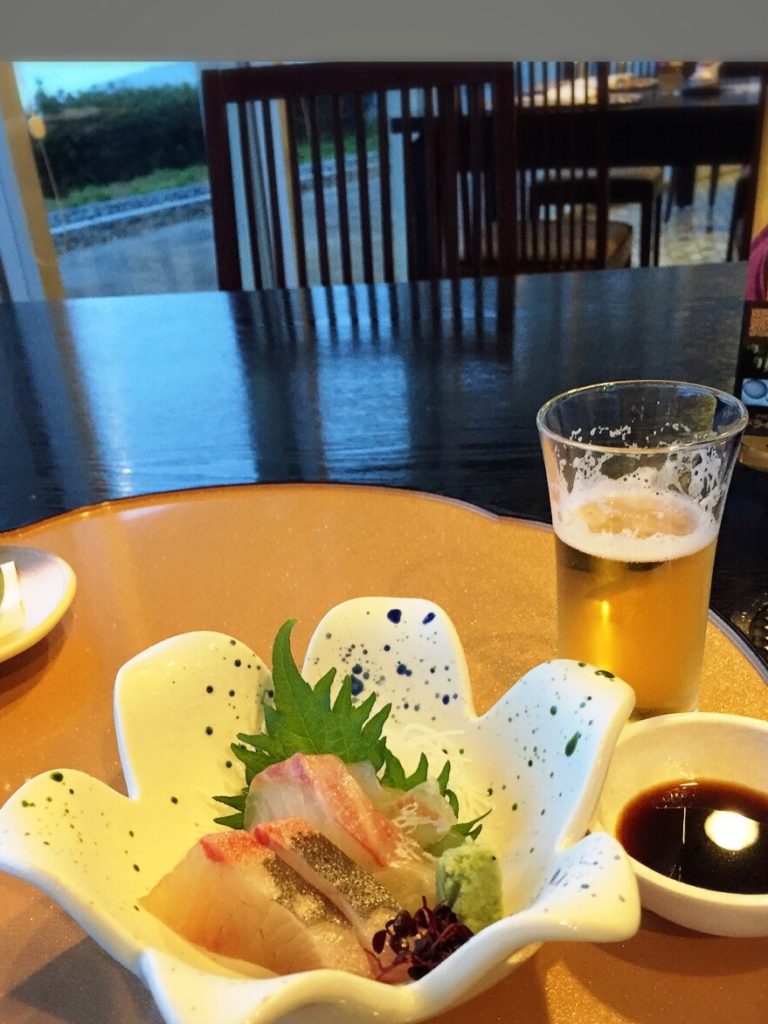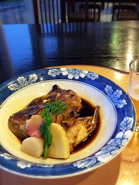 夕餉。ホテルのレストランで、和食会席を。鯛とカンパチのお造り、鯛のあら炊き、鰆の道明寺焼き。旨しだった。