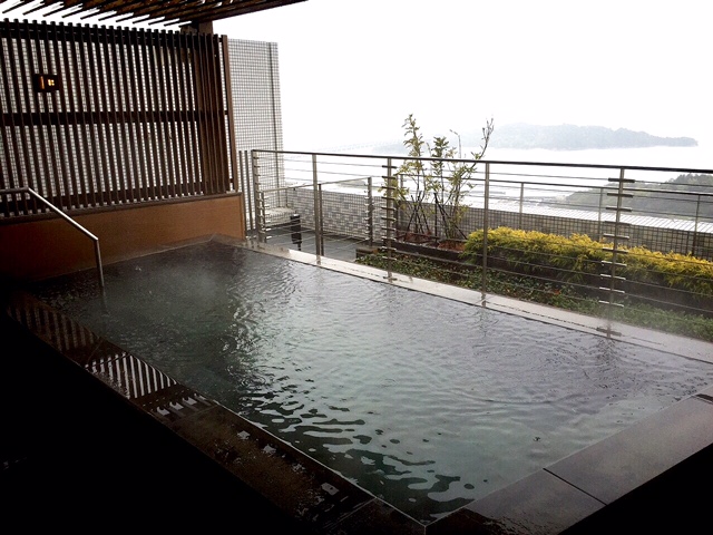ホテルの露天風呂、「瀬戸内さざなみの湯」。これが最高!この上なく快適だった。温泉ではないが・・・温度も少し低めでちょうど良く、長い時間入っていられる。とても柔らかい感じの湯のあたり。この日はあいにく雨で肌寒かったが、露天風呂に入るなら、少し寒いぐらいのほうが、むしろ有難みがあるというもの。この露天風呂はスケルトンの枠で覆われているので、入浴者に雨が直撃ではなく、その枠を伝った少し大粒の雨が、たま~に頭に当たる程度。それもまた、心地よかった。ここには、チェックイン後すぐ、夕食を食べる直前、夕食後にワインを少しいただいた後、翌朝と、計四回も入浴した。お風呂でこんなにリラックスできるの、いつ以来だろな・・・
