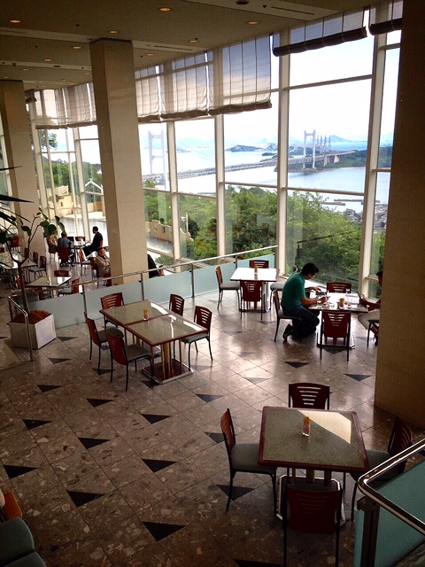ホテルのカフェ。このホテルは、部屋はもちろん、カフェやレストラン、あらゆるところから、瀬戸大橋が見える。素晴らしいな・・・