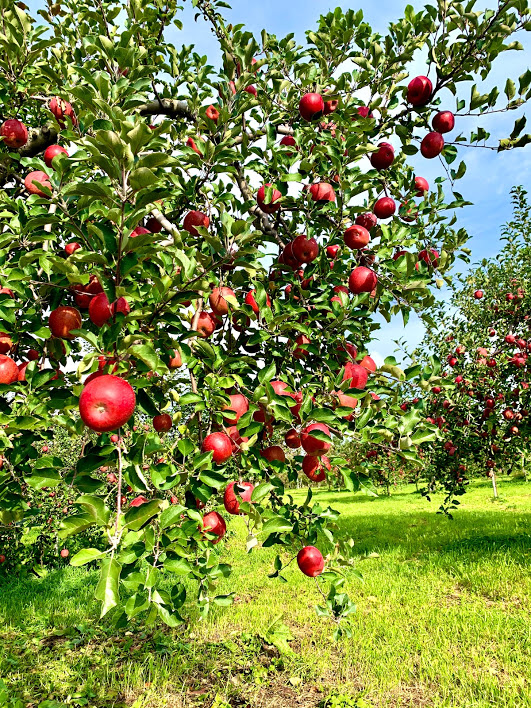 リンゴがなってるのをこんなに近くで見るのは初めて。空の青と黄の緑とリンゴの赤がきれいだな。