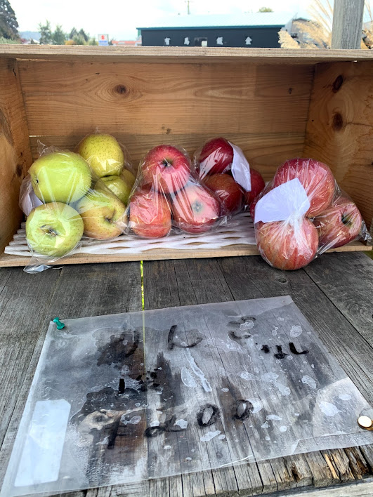 これはリンゴ農園が無人販売している図。取れたてのリンゴ4つで1袋200円は安いよな。奇遇にも、この道路沿い、鈴なりのリンゴに感動した男性がいて、やはりこの無人販売所に。