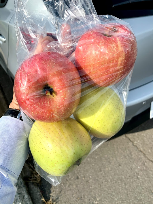 商談成立!二人でこんなふうに分けました。うーむ。今日のランチはこのりんごだな・・・(笑)。