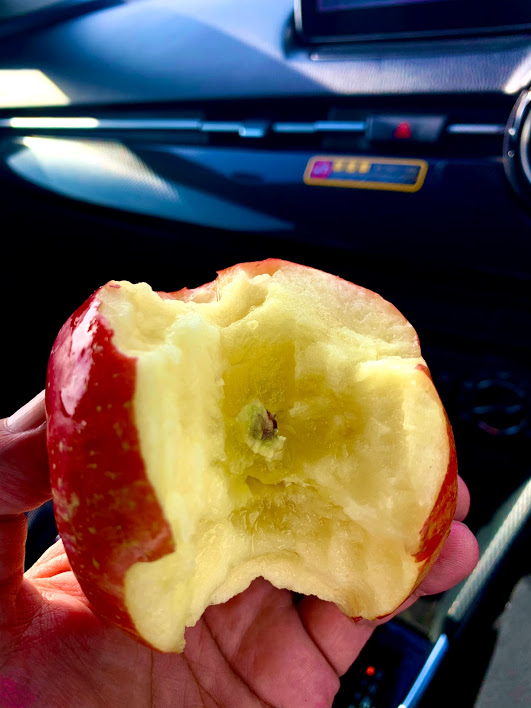 すぐに食べてみたら、これは美味しい!食べながら車を運転していたら、リンゴのジュースがどんどん出てきた。車を止めていただいたほうがいいな。
