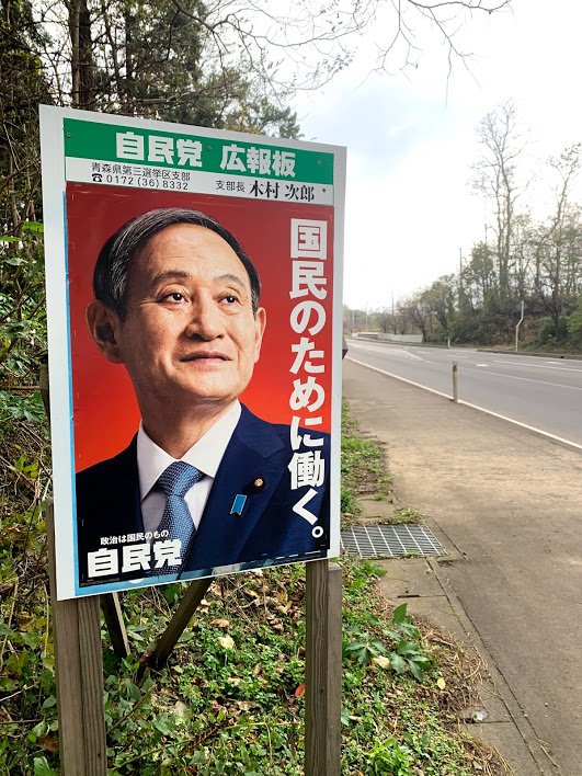 さらに進んでいくとこんな看板が。菅ちゃんだ。彼は確か秋田は湯沢の出身。ここは鯵ヶ沢というところだけれども。湯沢はここから100キロぐらい南に位置しているんだと思う。以前この看板は安倍ちゃんだったんだが、これが菅ちゃんに変わったということだよな。