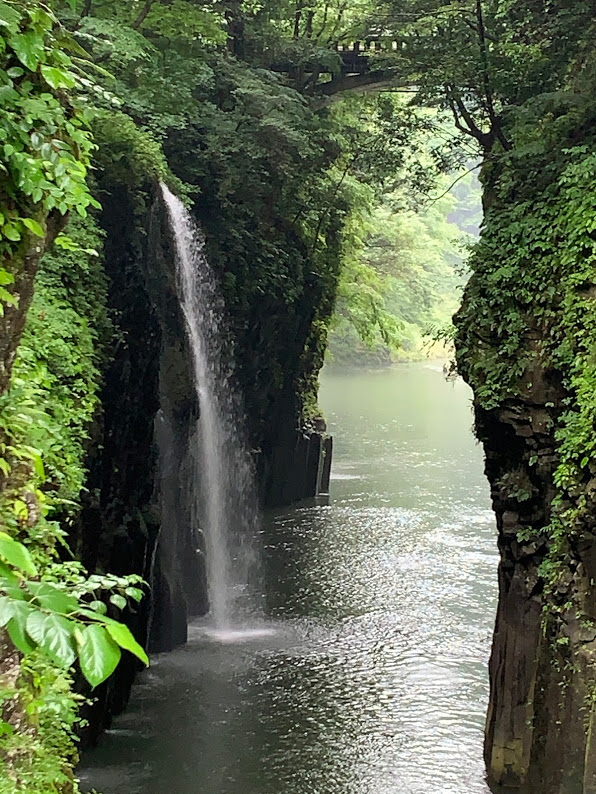 橋の上から高千穂峡と真名井の滝を望む。高千穂峡らしい写真だと思う。この真名井の滝は、ボートに乗って下から見るのが高千穂峡の神々しさを堪能する流儀なんだろうが・・・この日は天気が悪く、ボートがやっていなかった。残念。でも、きれいだよな。写真は遊歩道から撮ったものです。