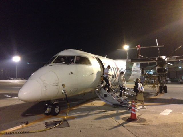 伊丹空港へ到着。プロペラ機から、階段で降りて、歩きで空港ロビーまで。夜のプロペラ機。ムードあるよな。