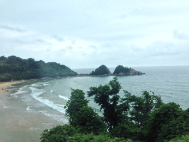 山陰本線。益田から出雲市へ戻る。その途中に見えた、山陰の日本海。三保三隅から浜田にかけて。日本海の景色は、どうしても天気に左右される。この日の天気は、晴れだけど雲が多い。まあまあかなぁ。それでもまあ、悪くはないと思うけどな。