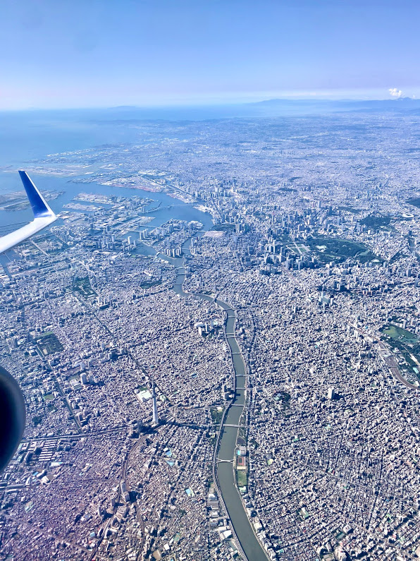向かって左側に席を取ると、離陸してすぐ、東京が眼下に一望できる。今回の旅は天気に恵まれたので、とてもクリアだったな。