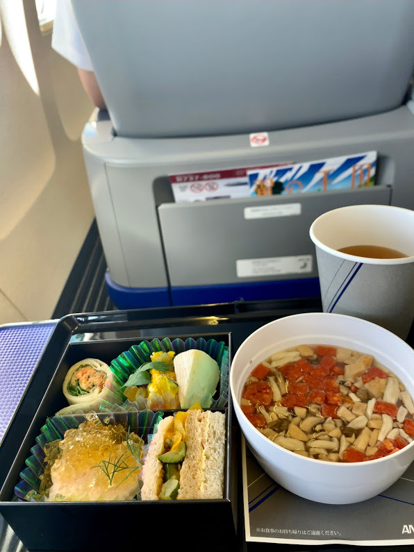機内では、離陸前からCAさんが。羽田ー能登便は飛行時間が55分と短いので、事前に飲み物をおうかがいしますねと、メニューを。朝の便なのに、シャンパンやワインもあるな。これは優雅・・・と一瞬は思ったが、能登に着いてからはすぐにレンタカーの旅。う~む。ここはあきらめ、コンソメスープをいただくことに。