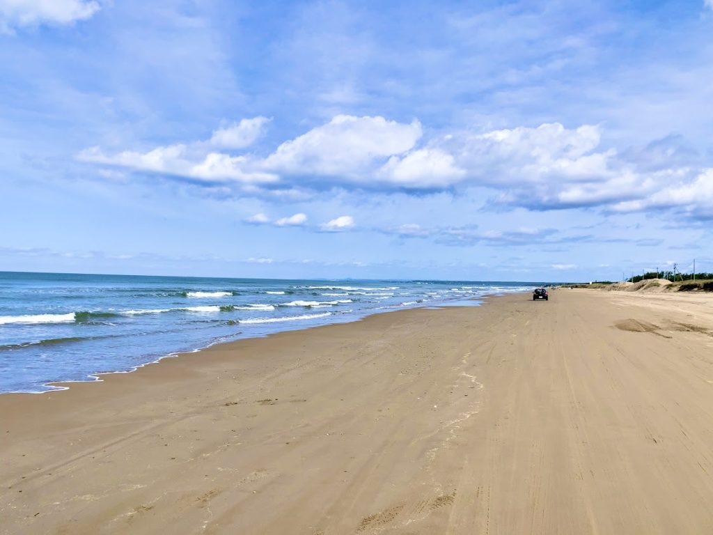 さてこれから、車で砂浜を走る。石川県の羽咋(はくい)市にある「千里浜なぎさドライブウェイ」約8kmの区間。まずは【日本唯一】千里旅ぐるたびHPの「千里浜なぎさドライブウェイで砂浜を爽快ドライブ!」に掲載されている写真を。