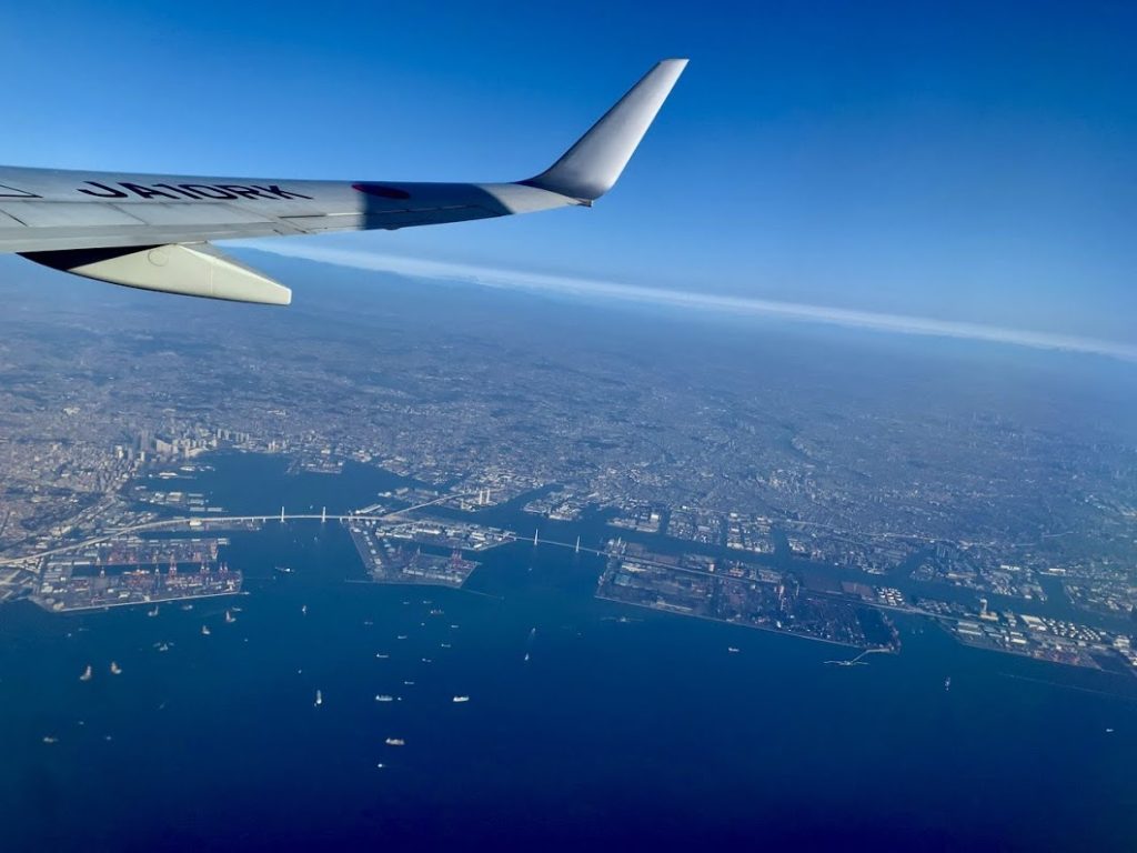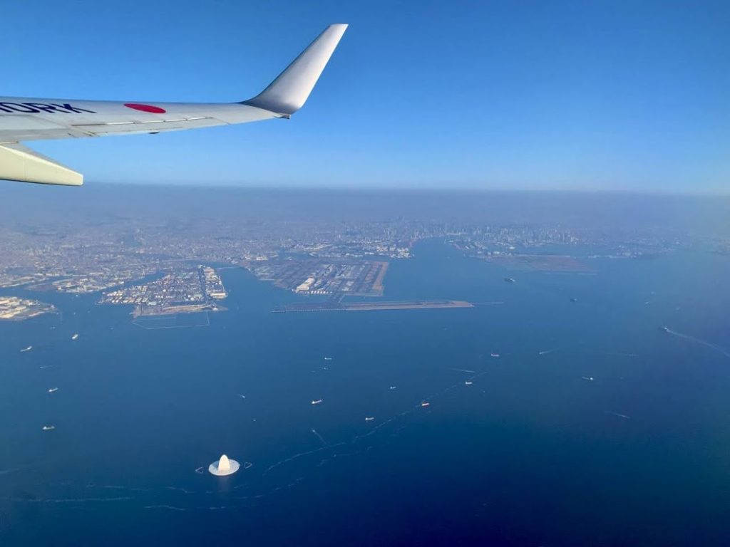 羽田から外房方面に飛び立ったJTA071便は、富津の手前あたりで大きく方向転換、西を目指す。右の窓から見えるのは、羽田空港と海ほたるだよな。