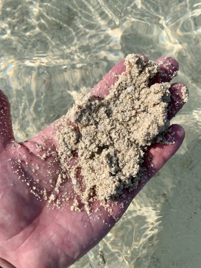 幻の島の砂。ガイドのあんちゃんに尋ねたら、ほぼほぼ、サンゴのかけらが砂になっていると。そうなんだ。
