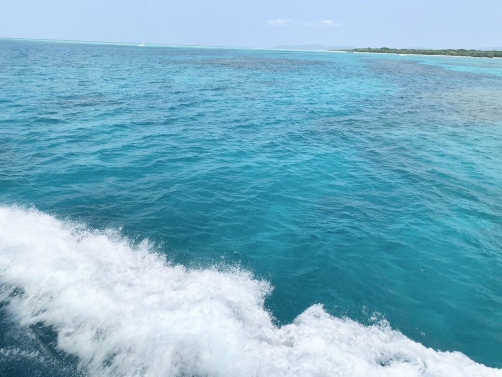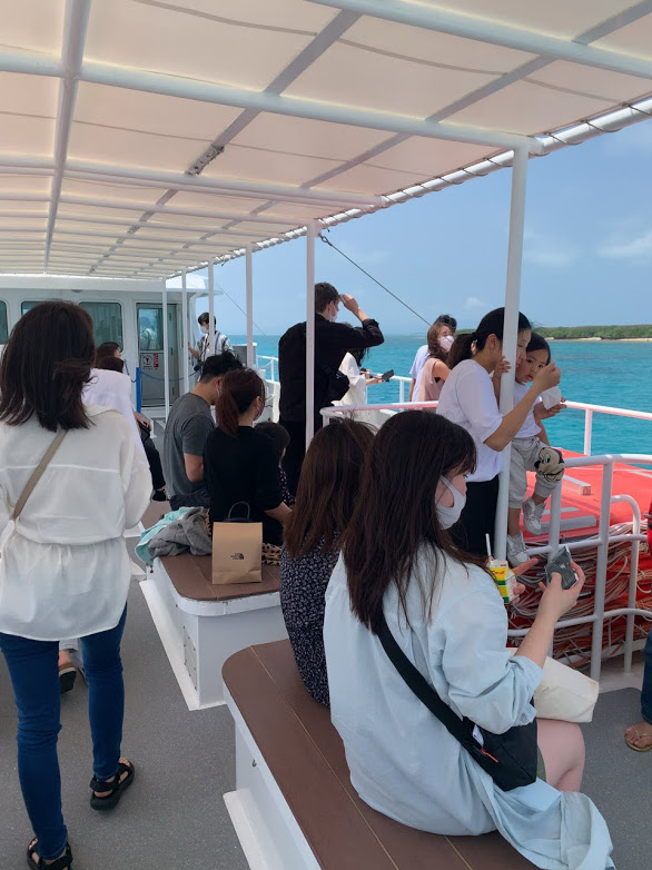 小浜島が近づくにつれ、海の色が青からマリンブルーに変わってくる。それにつれ、船室から甲板に出てきた人の数も増す。そりゃあ、この晴れの天気と海の色、そして心地よい海風なら、こちらのほうが良いよな。