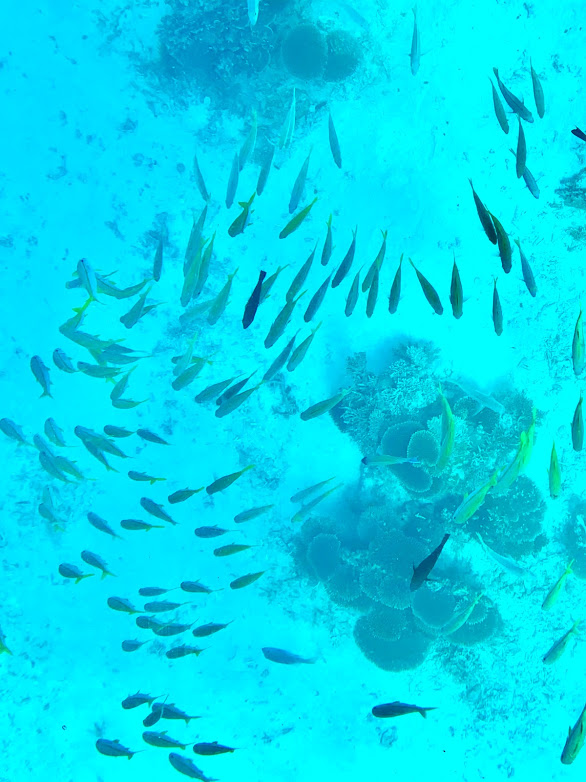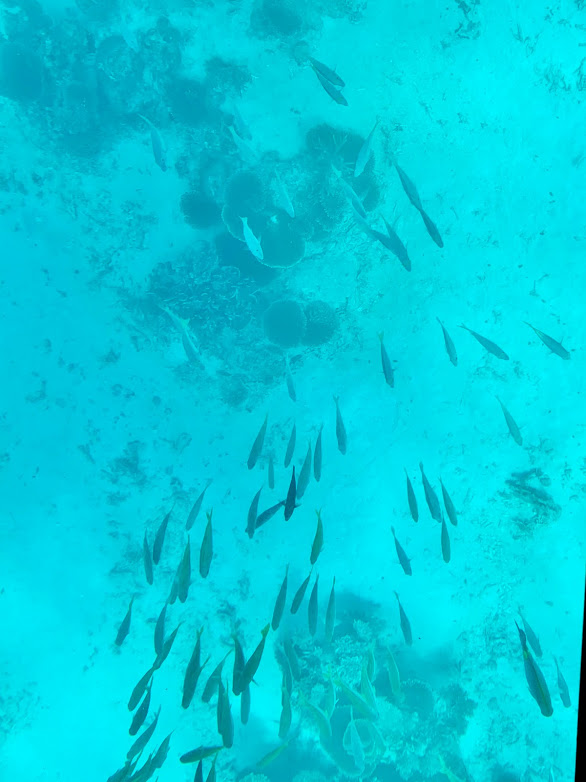 舟が動きだしてしばらくすると・・・魚がいるな!!たまに大群がやってくる。なんていう魚かはわからないけど、いわゆる南の海に入るサンゴ礁の魚。きれいだよな。
