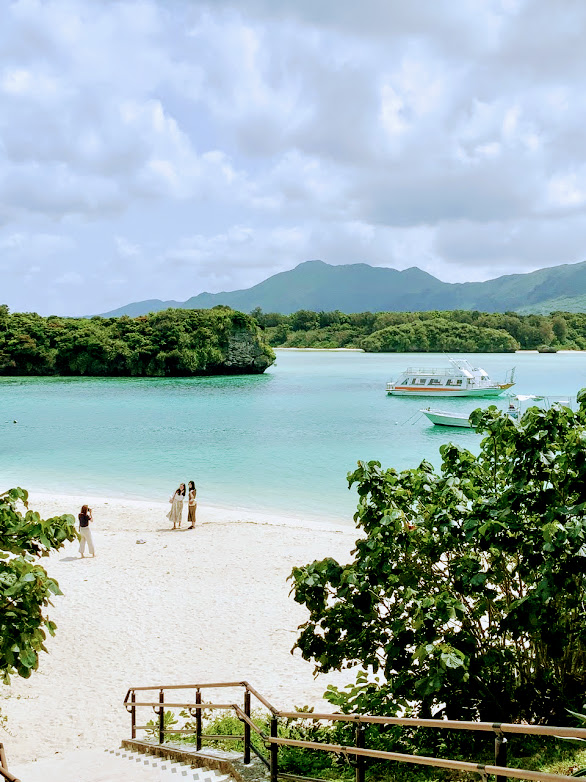 川平湾に着いた。これは好きな写真。良いムードだよなぁ。遠浅の海が広がる。女性3人組が楽しそうにしてるな。微笑ましい。
