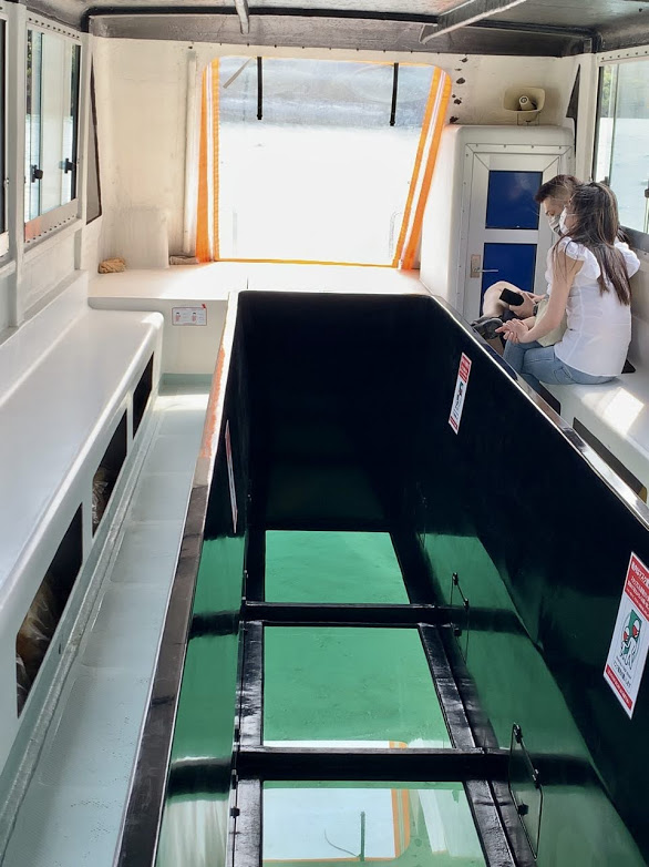 グラスボードの中はこう。真ん中がガラスになっていて、その下にサンゴ礁の魚が見えるようになっている。さてさて、覗いてみよう。