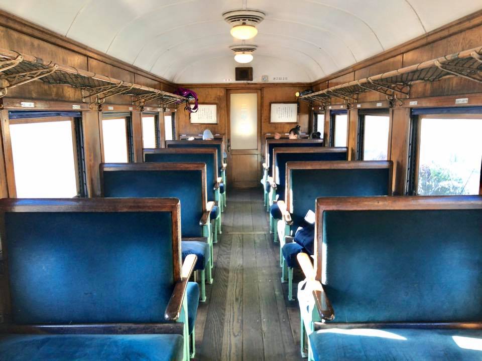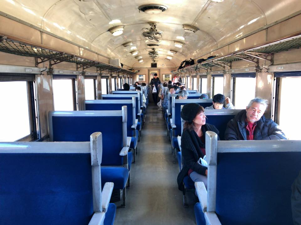 車内。座席は指定されている。車両の中は、昭和の40年代ムードがプンプン…最高だな。