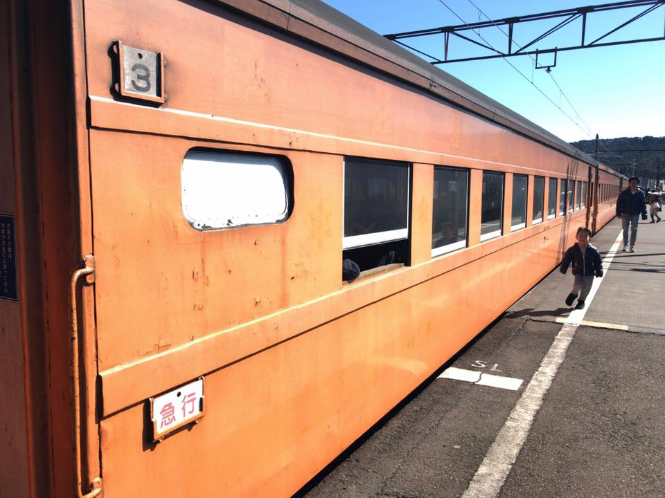 車両。やはりかつて、昭和の40年代頃に使われていた急行車両なんだろうが、なぜかオレンジ色に再塗装されている車両もあった。静岡みかんの色なのかな…