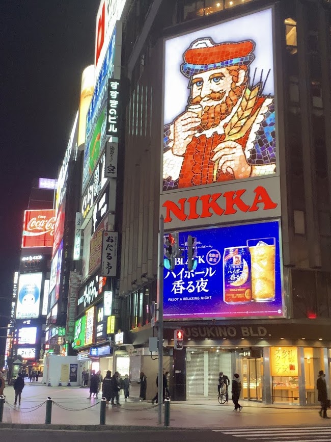 炉端焼きを堪能。夜のすすきのを散策しよう。前回、1月に来た時は気温は零下、小雪舞い散る中で散策などとんでもないムード。あらかじめ決めた店へ速攻で移動、そんな感じだったが、今は4月。ゆっくり散策できる。日が落ちるにつれ、このニッカの看板があるあたり、ここはすすきのの中心地だが、だんだんと良いムードになってきたな。
